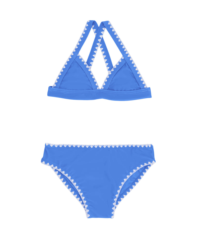 Triangle bikini top with criss-cross back straps for secure comfort and contrast white shell stitching for a fun, playful detail